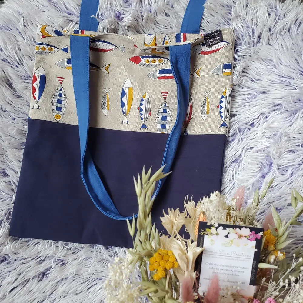 Modèle Citrons / Noir et jaune / Anses noires, Modèle Fleuri / Rouge / Anses beiges, Modèle I love Sailing / Bleu / Anses bleues, Modèle Licornes / Noir / Anses noires, Modéle Sardine / Bleu / Anses Bleues, Modèle Vans / Rouge / Anses beiges, Modèle Visages / Mauve / Anses noires, Modèle Visages roses / Mauve / Anses roses